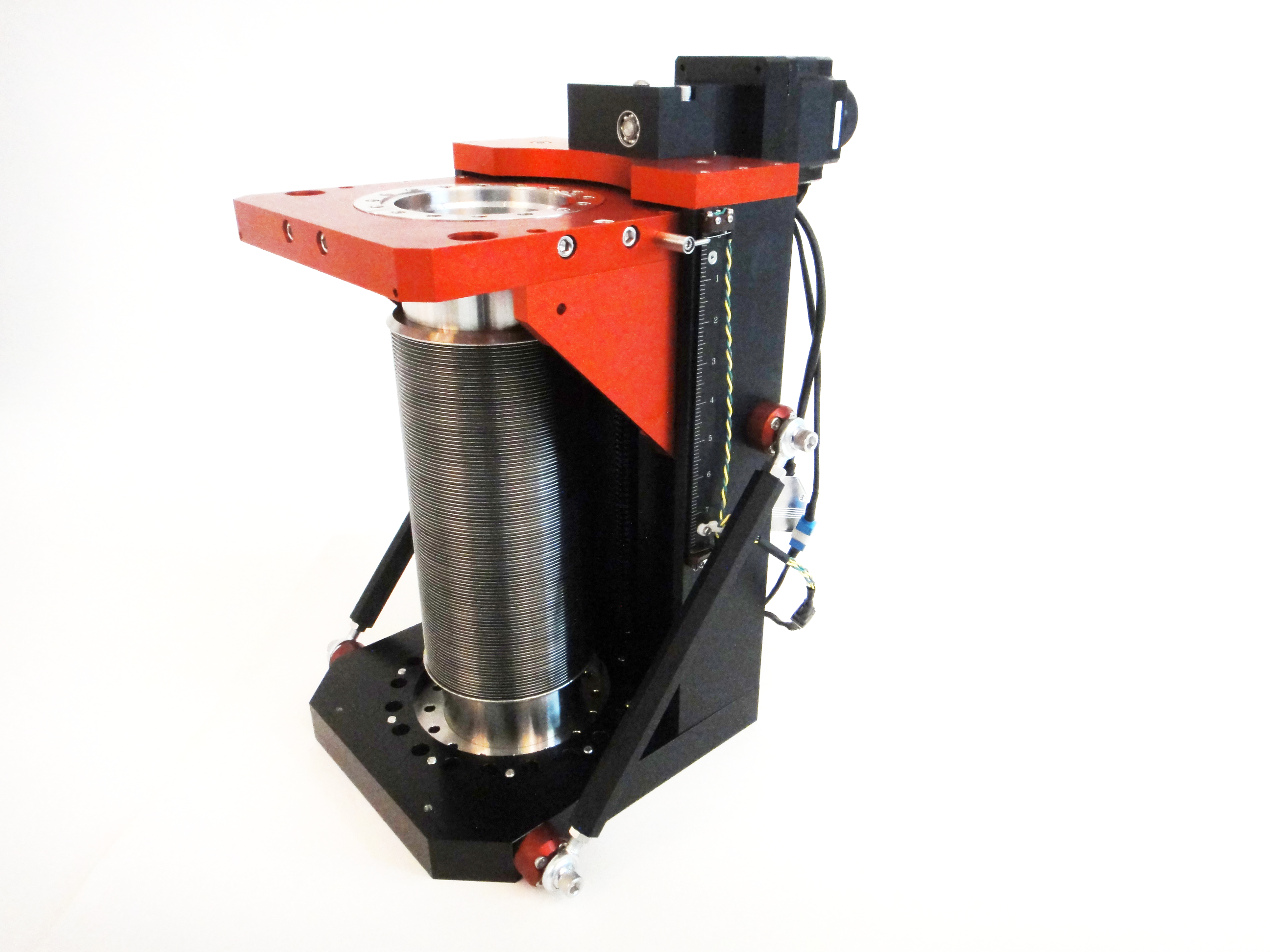 FBT series translators provide single-axis (Z only) motion. The units offer unparalleled mechanical support for customer payloads. They are available with bellows I.D.s of 3″–5″. Standard base and traveling flange sizes are 6″ O.D., with tapped or clearance holes, as required. Other flange diameters available. Options include 3-lead screw version for extra-heavy payloads (to 200 lbs.) and 10″ O.D. base flange for horizontal mounting. The Z drive is an acme screw with a precision 4:1 gearbox. The stage position is indicated to 0.001″ divisions.